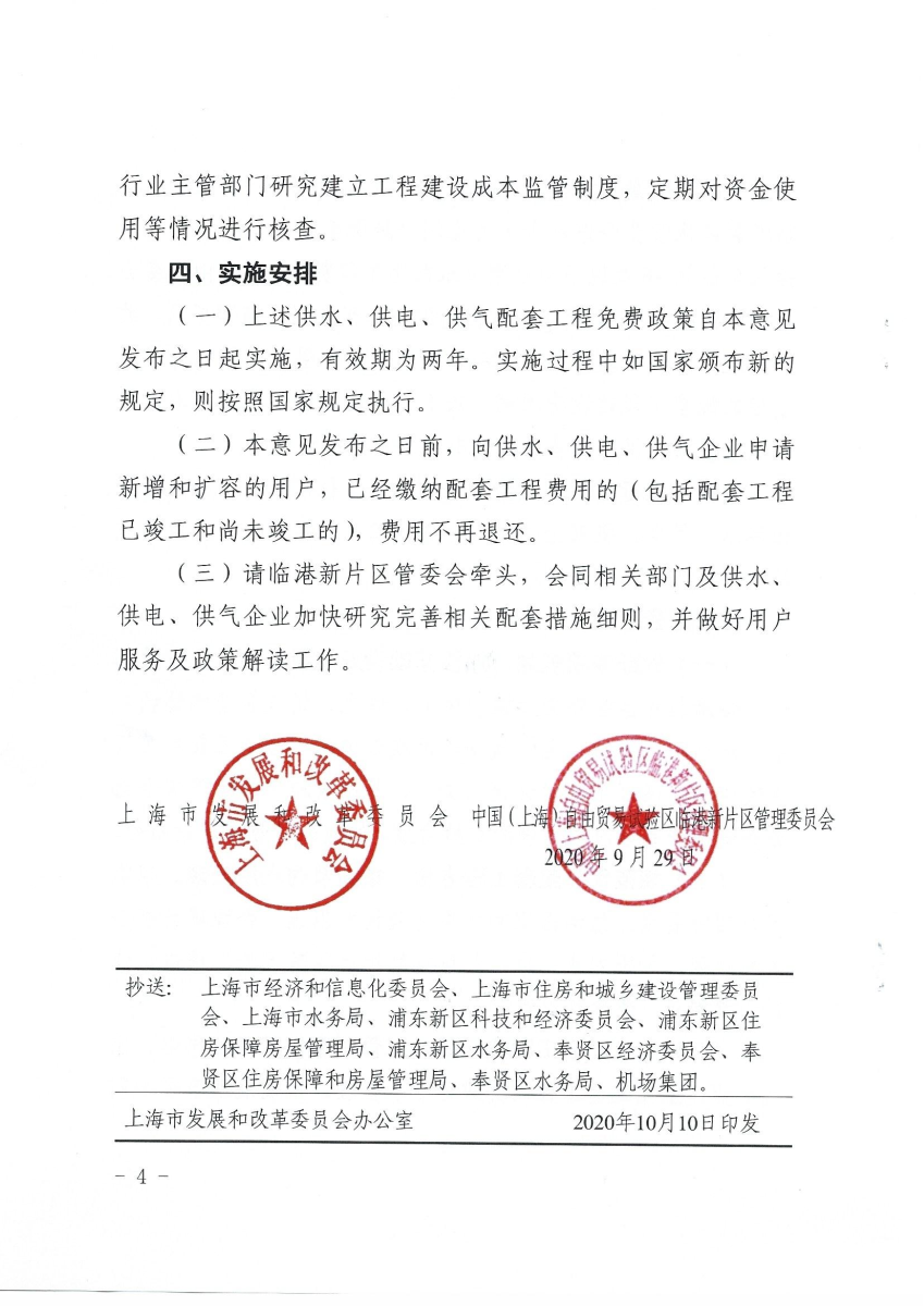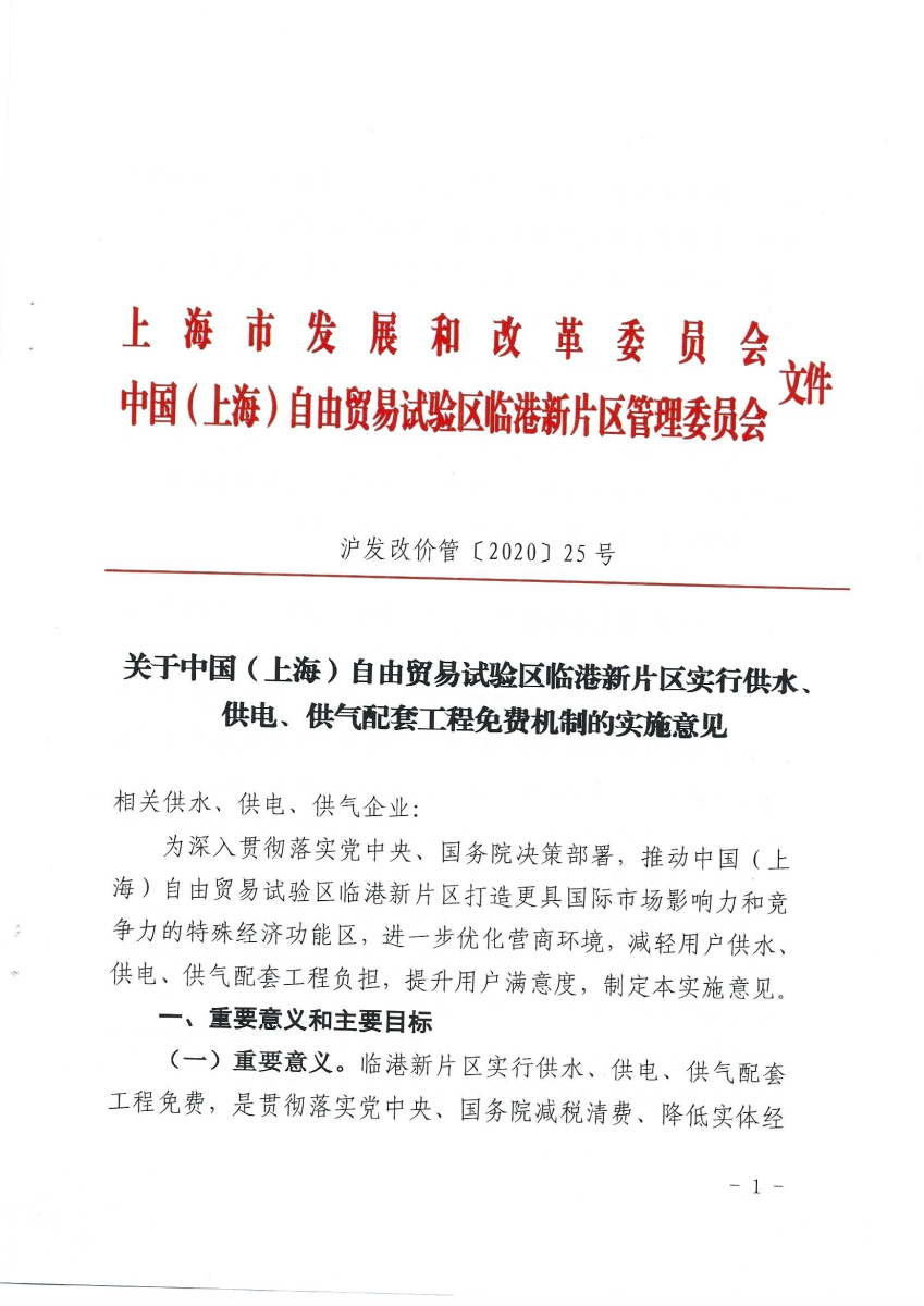关于中国(上海)自由贸易试验区临港新片区实行供水、供电、供气配套工程免费机制的实施意见