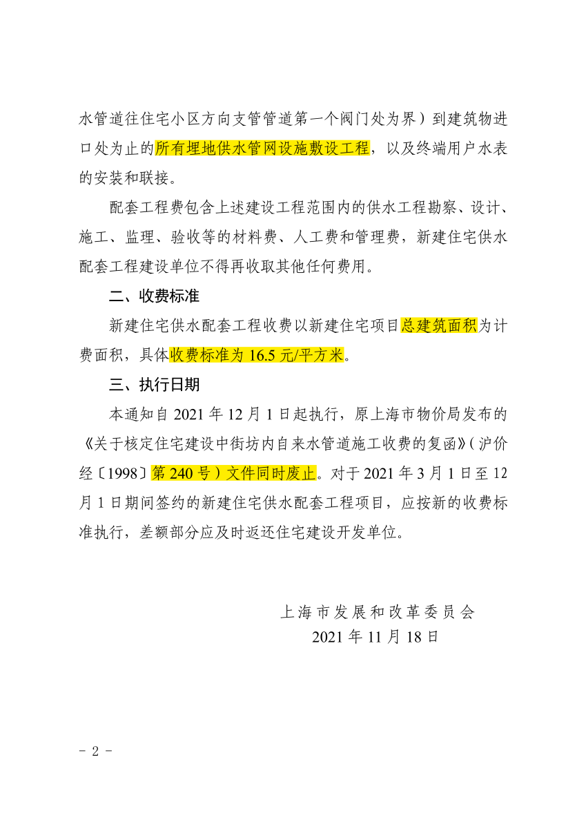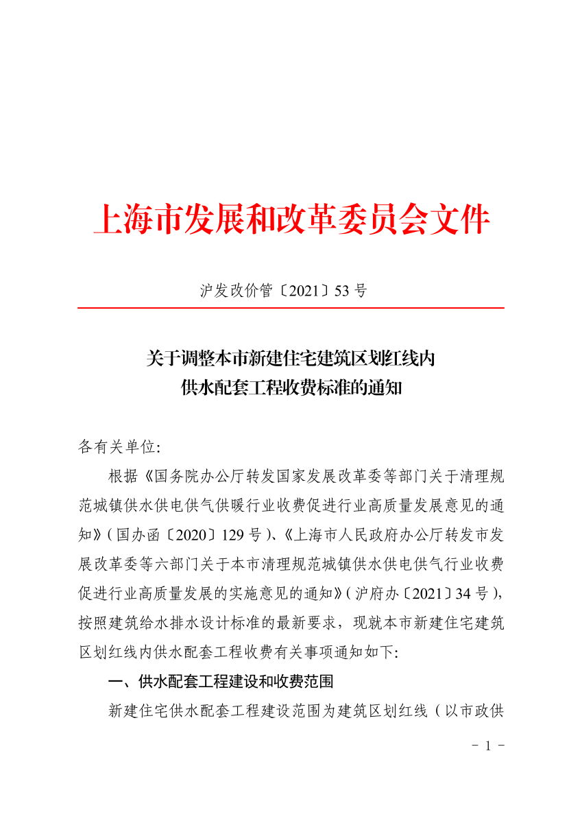 关于调整本市新建住宅建筑区划红线内供水配套工程收费标准的通知